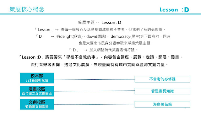 同時,臺南市政府也配合文博會在321巷藝術聚落、西竹圍之丘文創園區及藍晒圖文創園區推出「Lesson:D」主題策展,涵蓋「校本部」、「漫畫校區」及「文創校區」3大展區,將臺南整座城市化身為無邊界的大型學校。